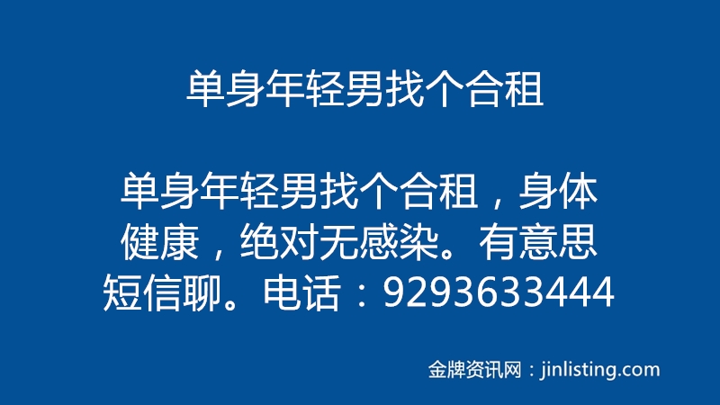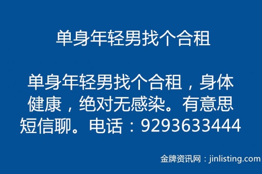单身年轻男找个合租,身体健康,绝对无感染。有意思短信聊。电话:9293633444