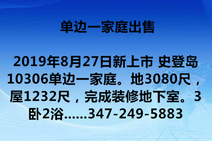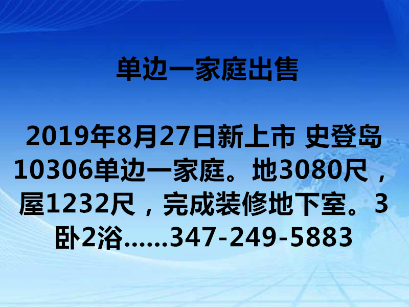 纽约史登岛好区单边一家庭出售 ~~新上市~~史登岛10306单边一家庭。地3080尺,屋1232尺,完成装修地下室。3卧2浴。交通便利,走路5分钟到巴士站,多路巴士到曼哈顿,唐人街和布鲁克林;走路7分钟到岛内火车站到轮渡。8分小学,7分中学和全美排名前10的科技高中都在附近。投资自住都合适,潜力巨大。售价$56万。咨询电话:347-249-5883
