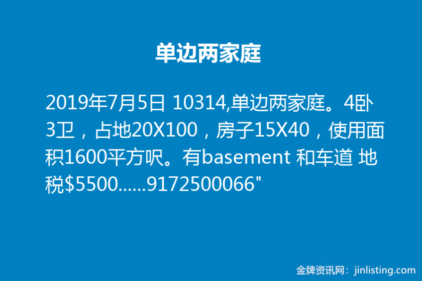 10314,单边两家庭。4卧3卫,占地20X100,房子15X40,使用面积1600平方呎。有basement 和车道… “1,10314,单边两家庭。4卧3卫,占地20X100,房子15X40,使用面积1600平方呎。有basement 和车道。地税$5500,叫价$59万8。预约看房,请电917-250-0066 2,布鲁克林,Cypress Hill. 两家庭,6卧3卫,加独立进出半土库。房子20X52,使用面积2128平方呎。R5, 地税$2054, 叫价$66万。有意者请电917-250-0066 3,10308,单边两家庭。4卧3卫,占地20X100,房子15X51,使用面积1531平方呎。太阳能屋顶,新翻新厨房。地税$5800,叫价$659,900.预约看屋,请电9172500066”