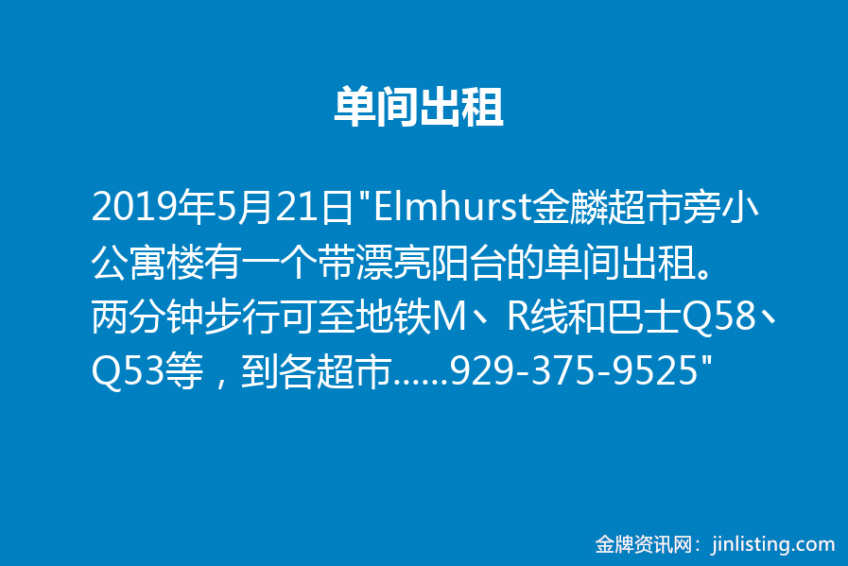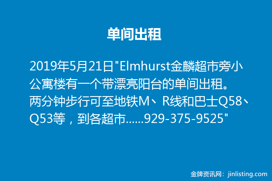 “Elmhurst金麟超市旁小公寓楼有一个带漂亮阳台的单间出租。两分钟步行可至地铁M丶R线和巴士Q58丶Q53等,到各超市丶洗衣店丶各银行丶Target/Best Buy丶星巴克和各餐饮糕点店等也都只有两分钟步行。 房间明亮干净安静。欢迎少炊丶简单丶喜干净的上班族女生或女学生。 详情请短信: 929-375-9525”