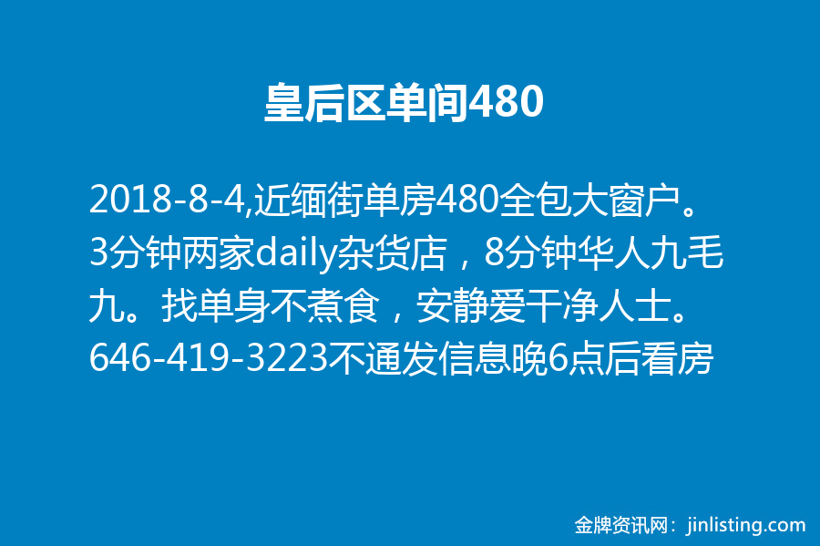近缅街单房480全包,大窗户。交通方便。3分钟两家daily杂货店,8分钟华人九毛九,洗衣店,餐馆,超市,有车位。找单身,不煮食,安静爱干净人士。电646-419-3223 如不通请发信息咨询 晚6点后看房