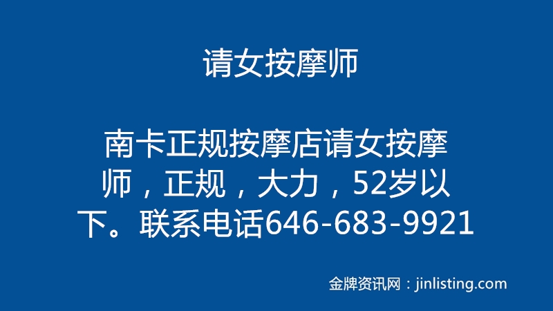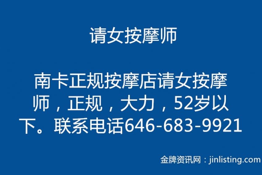 南卡正规按摩店请女按摩师,正规,大力,52岁以下。联系电话646-683-9921