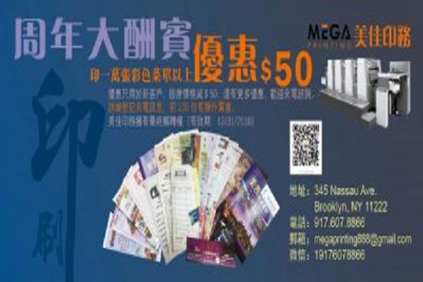 承接:餐馆菜单,包括堂吃,外卖菜单,Menu。 彩色,双色,黑白,普通纸,光面纸,各种尺寸,可供选择。 名片,联单,海报,广告,传单等平面纸类印务。现在周年酬宾,回馈客户大优惠,欢迎来电查询:917-607-8866,