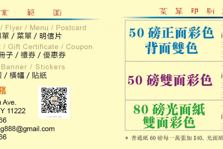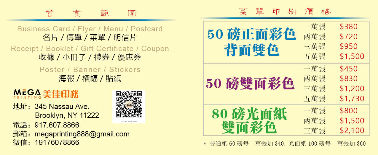 承接:餐馆菜单,包括堂吃,外卖菜单,Menu。 彩色,双色,黑白,普通纸,光面纸,各种尺寸,可供选择。 名片,联单,海报,广告,传单等平面纸类印务。现在周年酬宾,回馈客户大优惠,欢迎来电查询:917-607-8866,