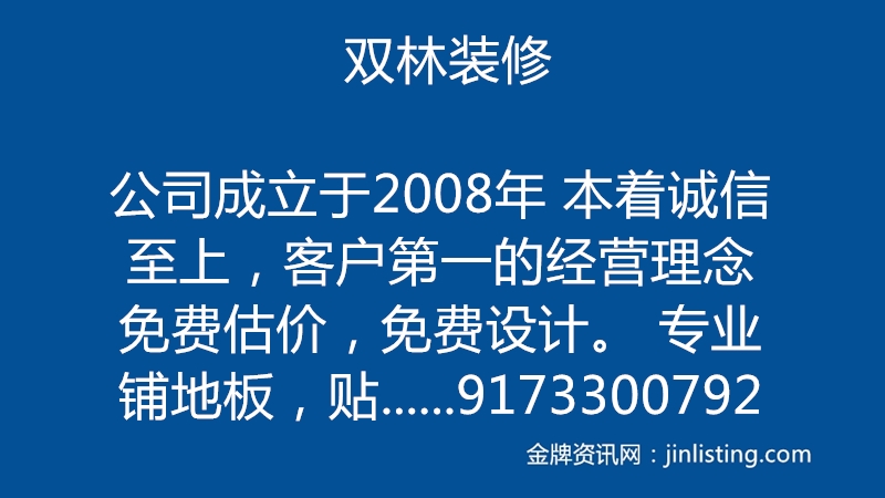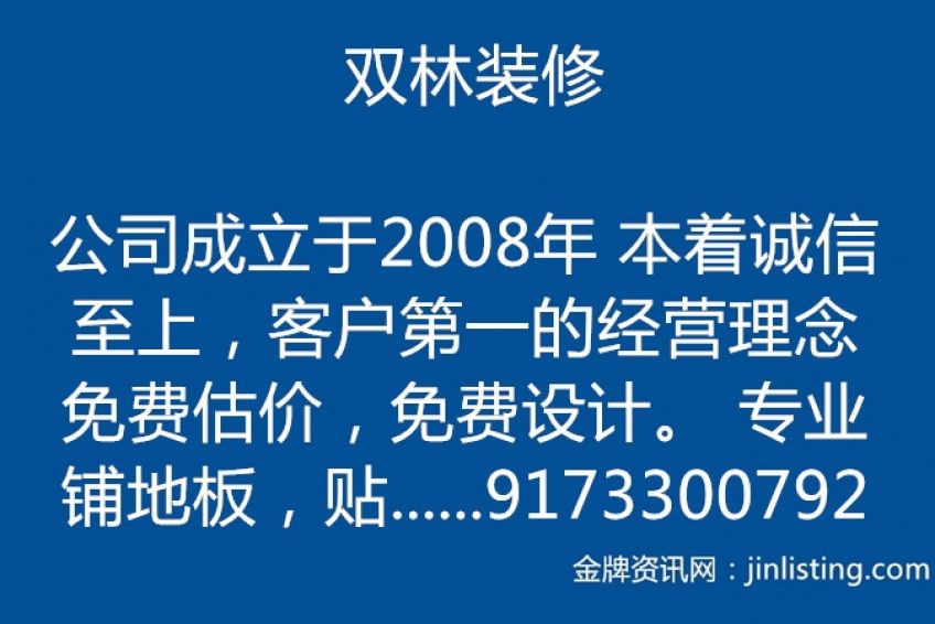 双林装修 公司成立于2008年 本着诚信至上,客户第一的经营理念 免费估价,免费设计。 专业铺地板,贴瓷砖,刷油漆,门窗更换,厨房,厕所,水电,隔断,指甲店,按摩店,家庭装修! 若有需要请拨打9173300792