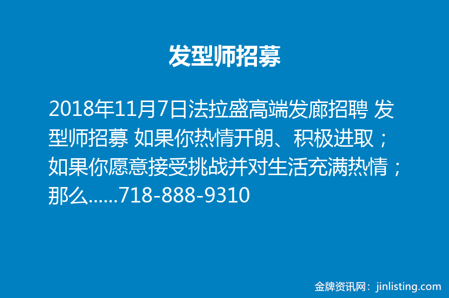 法拉盛高端发廊招聘 发型师招募 如果你热情开朗、积极进取;如果你愿意接受挑战并对生活充满热情;那么,你正是我们寻找的人!只要你愿意做,有热情肯奋斗,我们愿意给你机会。现在HAIIER正在寻找你~ 任职要求: 男女不限,20-40岁之间,国语以及基本英文流利; 形象好气质佳,熟练当代时尚美发技术,设计理念时尚而有品位 2年以上发型师经验; 热爱时尚行业,个人形象好、气质佳,工作热情、积极主动; 沟通能力好,能够为顾客提供优质服务。有良好的团队合作精神、具有亲和力、服务意识强。 工资待遇优,提成高,具体面议~ 工作时间:一周五/六天 10:00am-8:00pm 电话:718-888-9310 地址:43-08 Main St. Flushing NY 联系微信:zaofangstudio 店铺网页:www.haiier.com Ins:haiier_hair