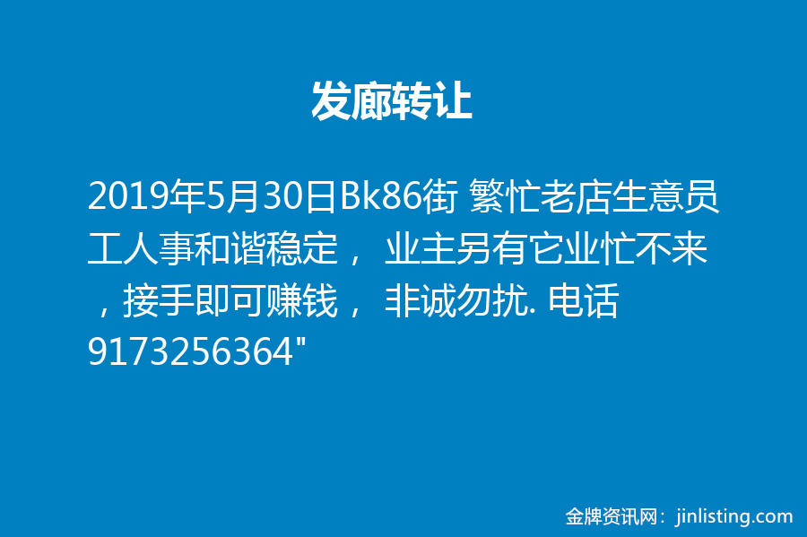 “发廊转让 Bk86街 繁忙老店生意员工人事和谐稳定, 业主另有它业忙不来,接手即可赚钱, 非诚勿扰. 电话9173256364”