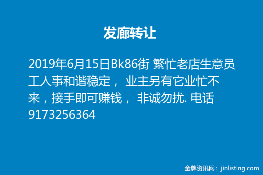 发廊转让 Bk86街 繁忙老店生意员工人事和谐稳定, 业主另有它业忙不来,接手即可赚钱, 非诚勿扰. 电话9173256364