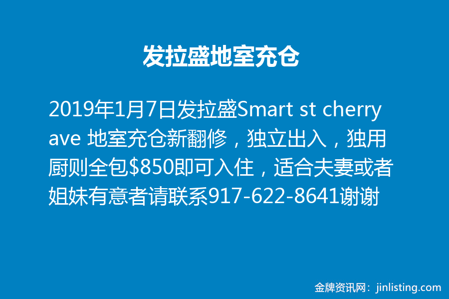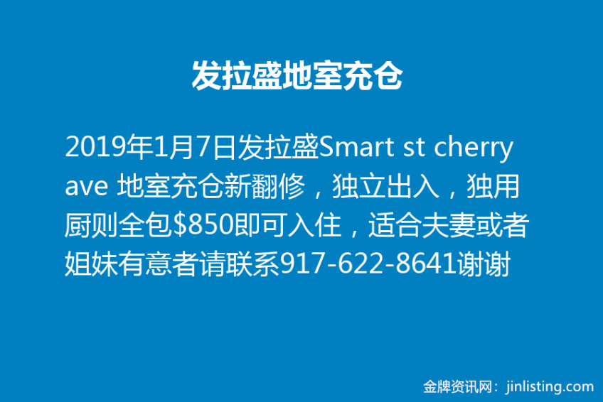 地室充仓 发拉盛Smart st cherry ave 地室充仓新翻修,独立出入,独用厨则全包$850即可入住,适合夫妻或者姐妹有意者请联系917-622-8641谢谢