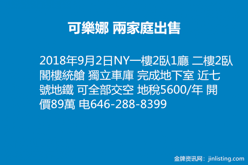 地25X100, 房子1536 呎,一樓2臥1廳,二樓2臥,閣樓統艙,獨立車庫,完成地下室。 近七號地鐵,可全部交空。地稅5600/年。開價89萬。电646-288-8399
