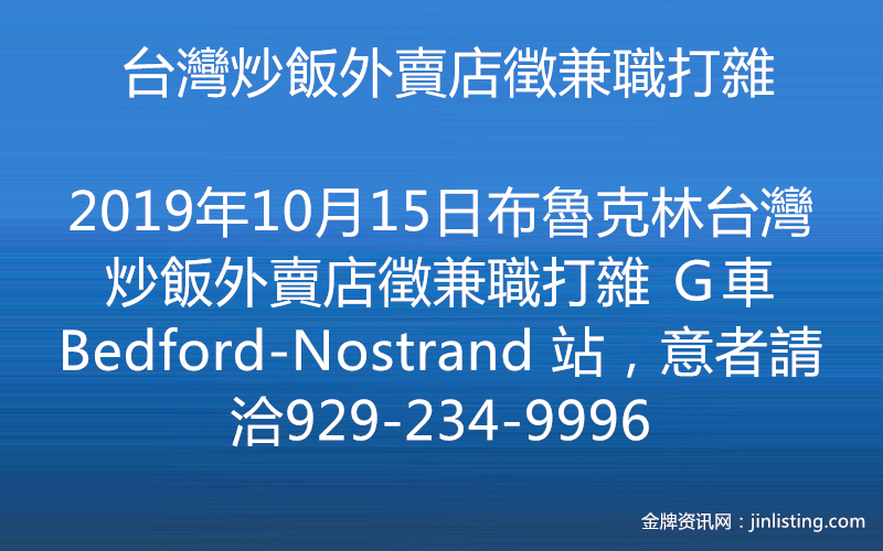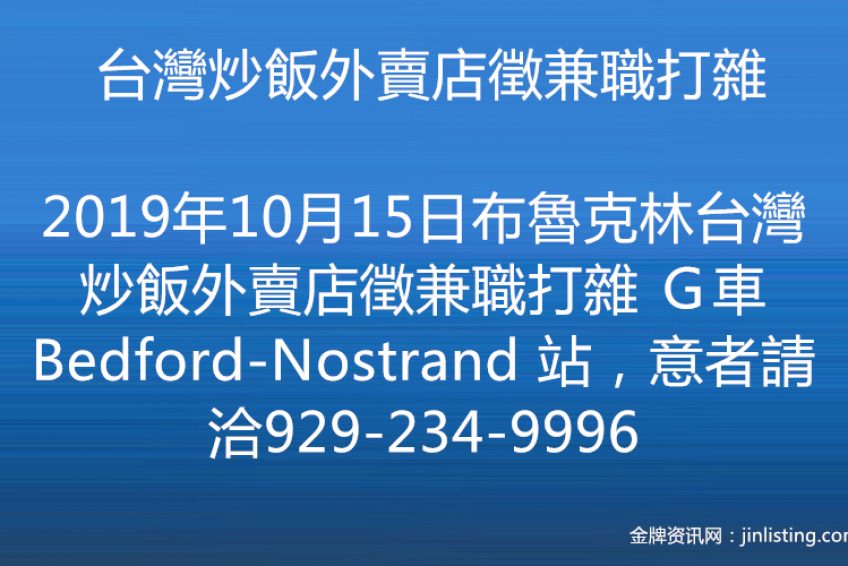 布魯克林台灣炒飯外賣店徵兼職打雜 G車Bedford-Nostrand 站,意者請洽929-234-9996
