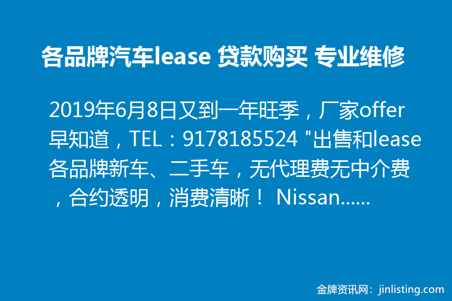 各品牌汽车lease, 贷款购买, 专业维修, 又到一年旺季,厂家offer早知道,TEL:9178185524 “出售和lease各品牌新车、二手车,无代理费无中介费,合约透明,消费清晰! Nissan、Toyota、Honda、现代、infinite、lexus、Acura、雪佛兰、Ford、Jeep、MINI、克莱斯科、凯迪拉克、奔驰、BMW、Audi、路虎、Maserati……… 可lease,可贷款购买。 另汽车维修,拖车,理赔保险等,售后完善,为您解决烦恼! 欢迎新信用朋友,欢迎留学生(无社安号,无credit history均可)! ! 电话:9178185524 (李小姐) 微信:luckyyuyangli或者扫下图二维码 法拉盛分行地址:7814 woodside Ave, Flushing , NY 11373 或法拉盛缅街出售各品牌新车、二手车,无代理费无中介费,合约透明,消费清晰”