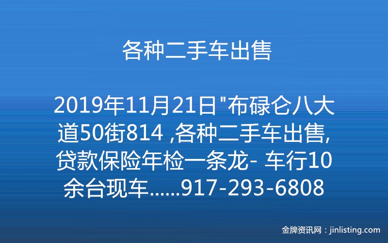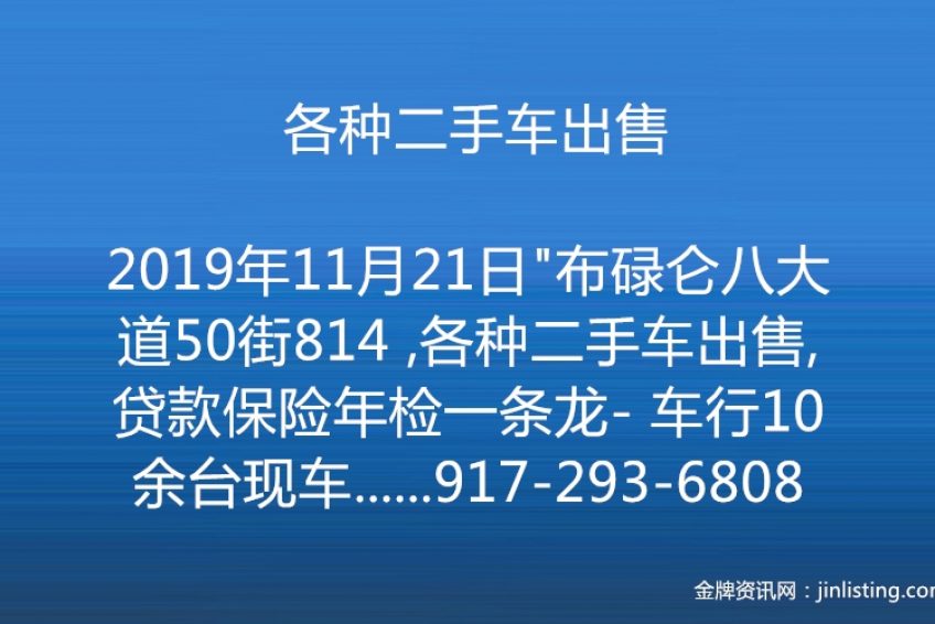 “—-布碌仑八大道50街814 ,各种二手车出售,,贷款保险年检一条龙- 车行10余台现车,任你挑选, 保证绝无事故,泡水车,90天,或3000非人为因素保修 让你购车更安全. 代客上牌低利息汽车贷款,保险一条龙服务 提供全面车辆检查,提供车辆完整历史记录,让您更安心 联系人:阿信 微信:axin5230 电话:917-293-6808 Email:axin9230@gmail.com 地址;814 50th steet brooklyn NY 8大道50街 ,”