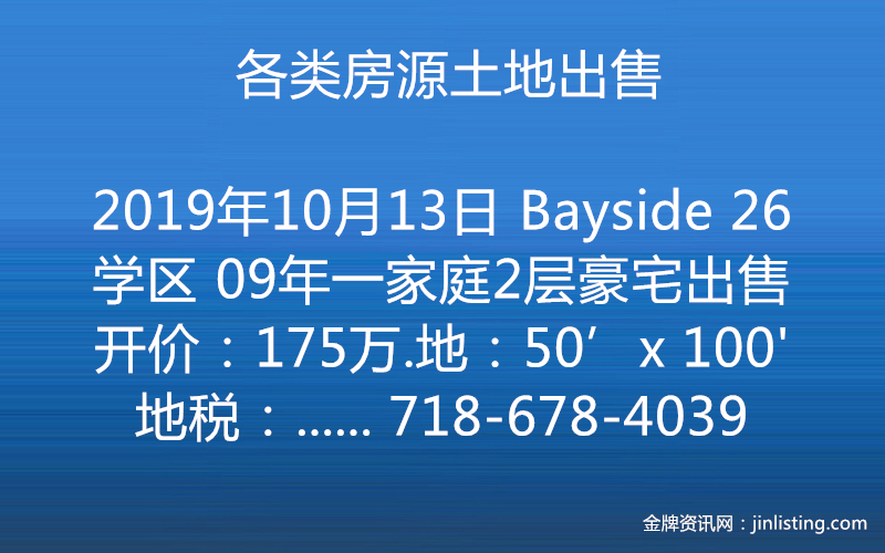 各类房源土地出售 “————————————————— Bayside 26学区 09年一家庭2层豪宅出售 开价:175万. 地:50’ x 100′ 地税: 11883/年 R2A 内部豪华装修. 近学校, 公园超市等。生活方便 安静宜居. 3房4.5卫。完成地下室. 请联系经纪JEFF : 718-678-4039 ————————————————— 森林小丘相邻2块土地出售 开价:380万 1)19.25 x 100 地税:7137/年 2)19 x 100 地税:11928/年 共3825 SF R7-1 Zoning 近Queens Blvd,学校,生活便利. 建商投资机会! ——————————————— 布鲁克林Bushwick 2栋 2家庭出售 开价480万. 2栋楼2017年全部翻新(除一栋保留门面外,其余全换新) 地税$7629/年,$2632/年. R6 zoning 每栋还可以加建1560SF. 目前4收入,月租金收入共:$25000 回报率高达6% 近地铁公交. 欢迎合作 —————————- 法拉盛中心Condo 出售 (限客人) 140-00 Cherry Ave Flushing。 2房2浴(1045呎)超好格局!大厅挑高Ceiling(18尺高度).管理费$275/月 减税中…$19/月。 近一切!自住投资俱佳!有车位!售$73万 ————————— Kew Garden Hills 稀有房源 一房Coop 合作公寓出售 (限客人) Board友好 易通过 交通十分方便Q20 Q44直达法拉盛中心 EF直达曼哈顿 9分学校 环境非常好 没有FlipTax 大楼共三层 位处第二楼层 朝南 光线充足 合理价22万 管理费 $622 绝对好价钱 买到就是赚到 千万不要错过哦 ————————— 投资者看过来!独家未上市! (限客人) 出售corona 中心663砖房,地面三层?地下室,有阳台, 靠近corona 公园,近7号地铁,离法拉盛七分钟,仅售139万8! 好租客按時交租,每个月稳定收入7800,年租金收到86400,回报率5%以上! 房子面积每层1000尺! 一楼二房一厅一卫?车位, 二楼三房一厅二卫, 三楼各三房一厅二卫, 无需装修 过户就收租! 低地税才9000 !好机会! —————————— Corona中心合法两家庭出售【售价95.8万】处在繁华商业街中心,你不容错过去的好房 (限客人) 地大25*125,房子20*35. R5的zoning,可以加建多家庭 半条街到7号地铁可收租$6000左右,完成地下室,? 一楼四房,?二楼一房,三楼两房,,地税$5184 ————————— 更多房源出售出租买卖,商业租赁买卖. 请联系经纪Jeff: 718-678-4039”