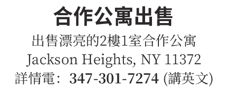 出售Jackson Heights,NY 11372漂亮的2樓1室合作公寓,了解詳情請電347-301-7274,講英文。
