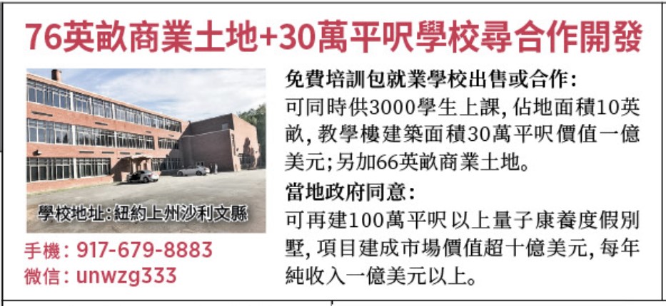 免费培训包就业学校出售或合作:可同时供3000学生上课,占地面积10英亩,教学楼建筑面积30万平尺价值一亿美元;另加66英亩商业土地,当地政府同意:可再建100万平尺以上量子康养度假别墅,项目建成市场价值超十亿美元,每年纯收入一亿美元以上。
