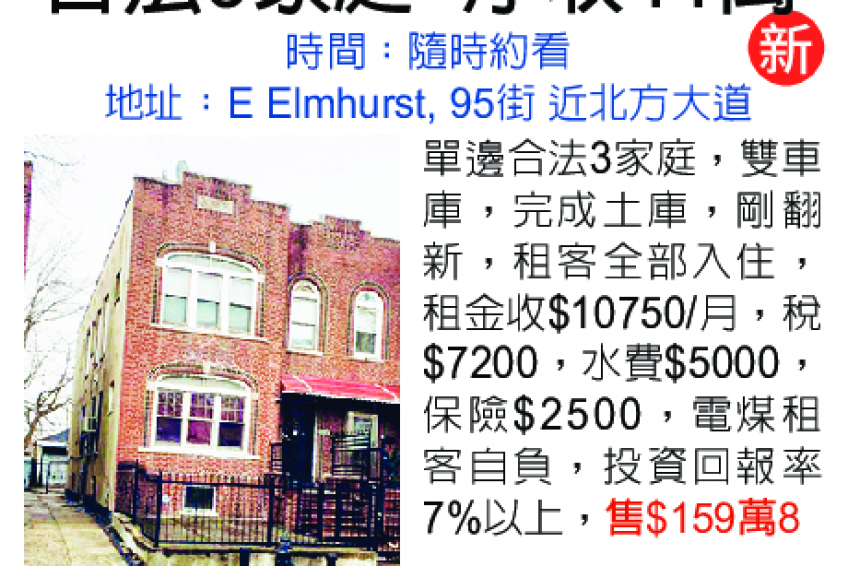 單邊合法3家庭,雙車庫,完成土庫,剛翻新租客全部入住,租金收$10750/月,稅$7200,水費$5000,保險$2500,電煤租客自負,投資回報率7%以上,售$159萬8。
