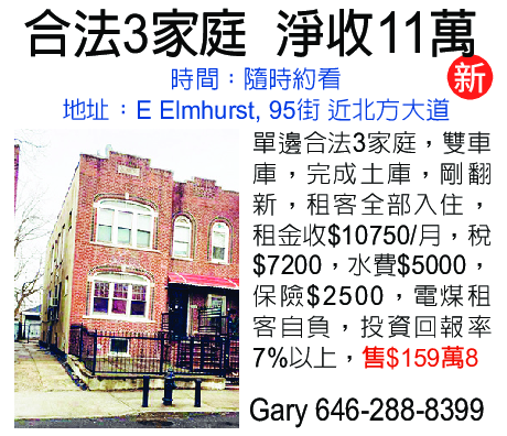 合法3家庭 淨收 11萬 646-288-8399