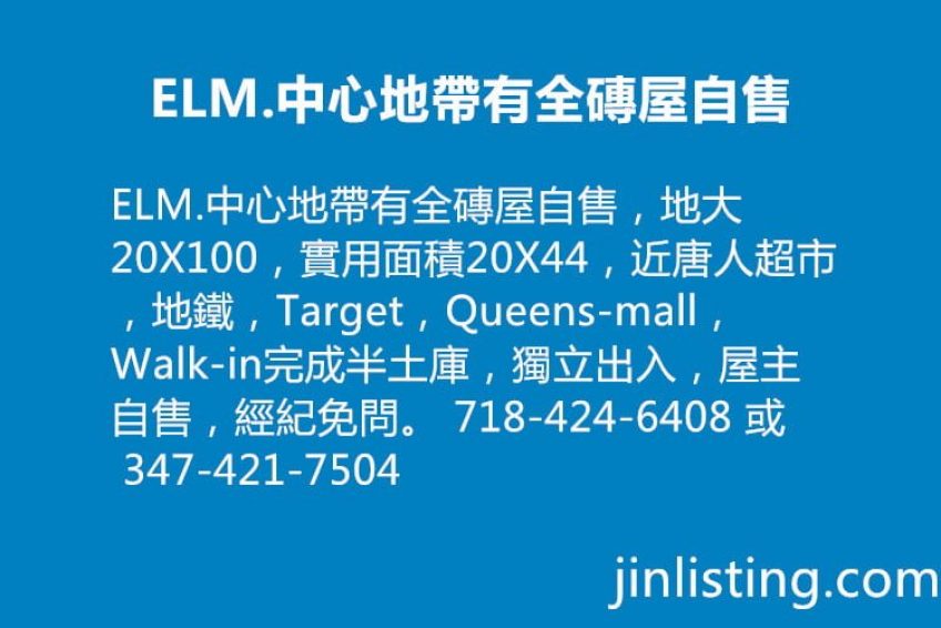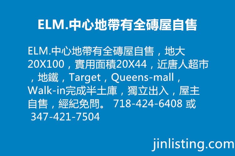 ELM.中心地帶有全磚屋自售,地大20X100,實用面積20X44,近唐人超市,地鐵,Target,Queens-mall,Walk-in完成半土庫,獨立出入,屋主自售,經紀免問。 718-424-6408 或 347-421-7504