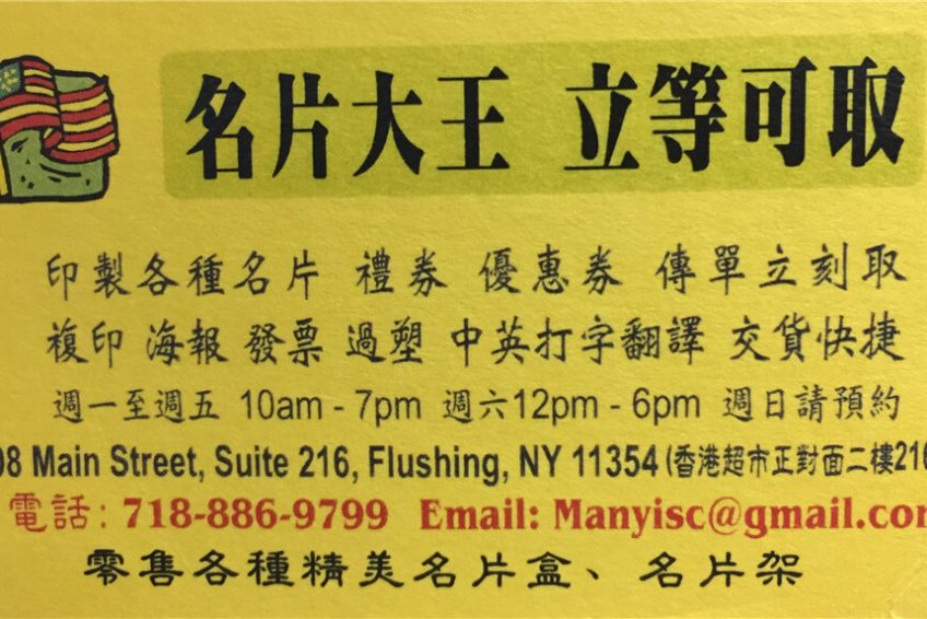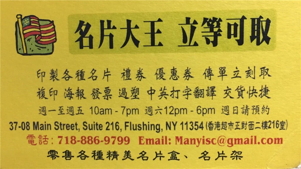 複印 海報 發票 過塑 中英打字翻譯 交貨快捷 週一至週五10am一7pm 週六12pm一6pm 週日請預約 37-08 Main Street, Suite 216, Flushing, NY 113541香港超市正對面二樓216室) 電話:718-886-9799 Email: Manyisc@qmaif.com 零售各種精美名片盒、名片架