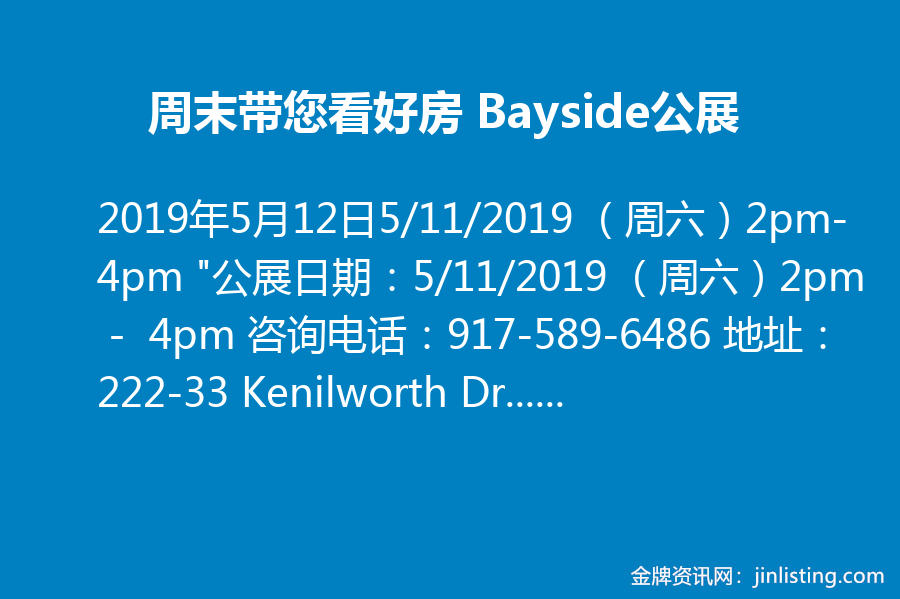 周末带您看好房 Bayside公展:5/11/2019 (周六)2pm-4pm “公展日期:5/11/2019 (周六)2pm - 4pm 咨询电话:917-589-6486 地址:222-33 Kenilworth Dr., Bayside, NY 11364 售价:$1,190,000 (如果希望微信公众号观看, 请到 https://mp.weixin.qq.com/s/DufDFzvltLQ7pUhrdXStbQ) 本周介绍的房屋是位于纽约是皇后区 Bayside 的一套独栋别墅。Bayside 社区环境优美,配套完善,交通便利,隶属于受到热捧的优秀学区26学区,更被 CNN Money 评为全美最昂贵的住房市场之一, 因此一直是中高产家庭的置业首选。”