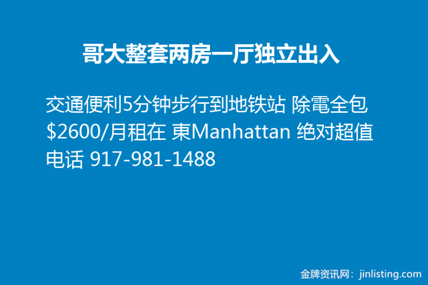 水暖气全包 $2600/月租在 東Manhattan 绝对超值