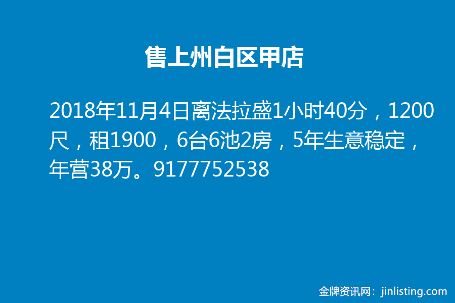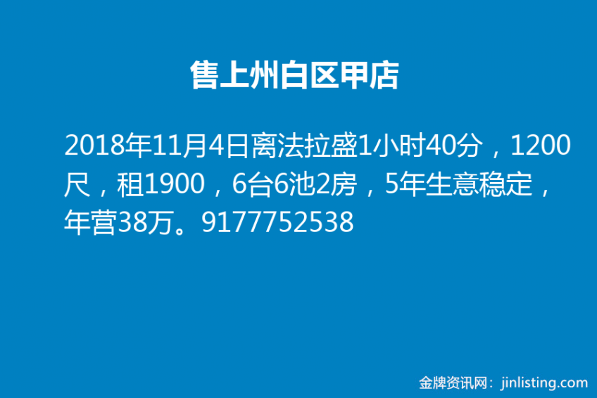 售上州白区甲店,离法拉盛1小时40分,1200尺,租1900,6台6池2房,5年生意稳定,年营38万。9177752538