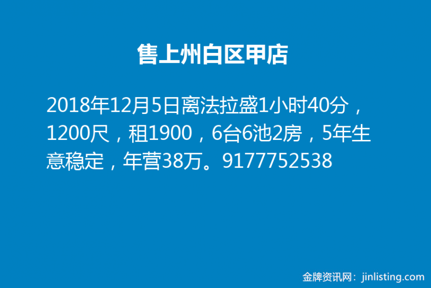 售上州白区甲店,离法拉盛1小时40分,1200尺,租1900,6台6池2房,5年生意稳定,年营38万。9177752538