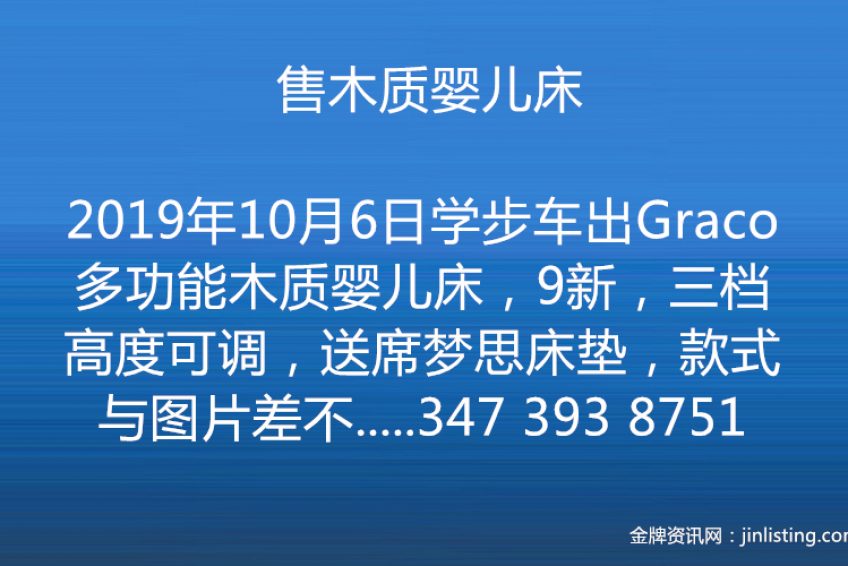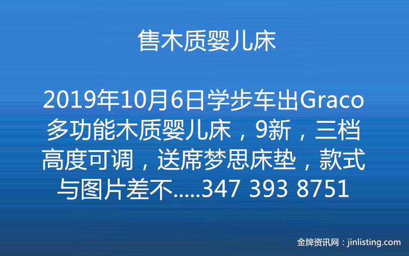 售木质婴儿床,学步车 出Graco多功能木质婴儿床,9新,三档高度可调,送席梦思床垫,款式与图片差不多,只有一张实图,抱歉由于其他床板与床垫都用胶袋包住防尘所以无实图,用了大半年,现在孩子带回国内所以闲置了,售$80刀,还有学步车售$10刀,Elmhurst自提,可短信至347 393 8751