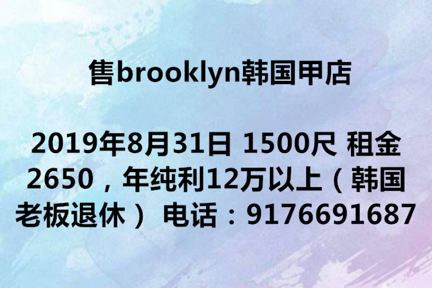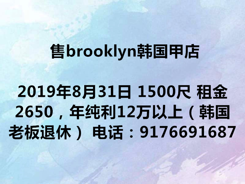 售brooklyn韩国甲店,1500尺 租金2650,年纯利12万以上(韩国老板退休) 电话:9176691687