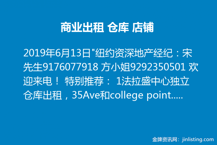 商业出租!仓库 店铺 “纽约资深地产经纪:宋先生9176077918 方小姐9292350501 欢迎来电! 特别推荐: 1法拉盛中心独立仓库出租,35Ave和college point交接处附近,面积8600尺多,租金22000/月包地税,欢迎咨询! 2.Maspeth大型仓库出租,有冷冻和冷藏,总共5万尺可分租,19尺高,卸货台、停车场都有,租金$22/尺,495上18出口,欢迎咨询 3大学点仓库 20 Ave 3800尺,18尺高,7个车位 租金7500 4大学仓库 20 Ave 一楼3800尺,二楼2500尺办公室 租金12000 5.布鲁克林靠278公路修车行出租,地面积1万尺,室内面积1500尺,租金$9900含地税,欢迎咨询”