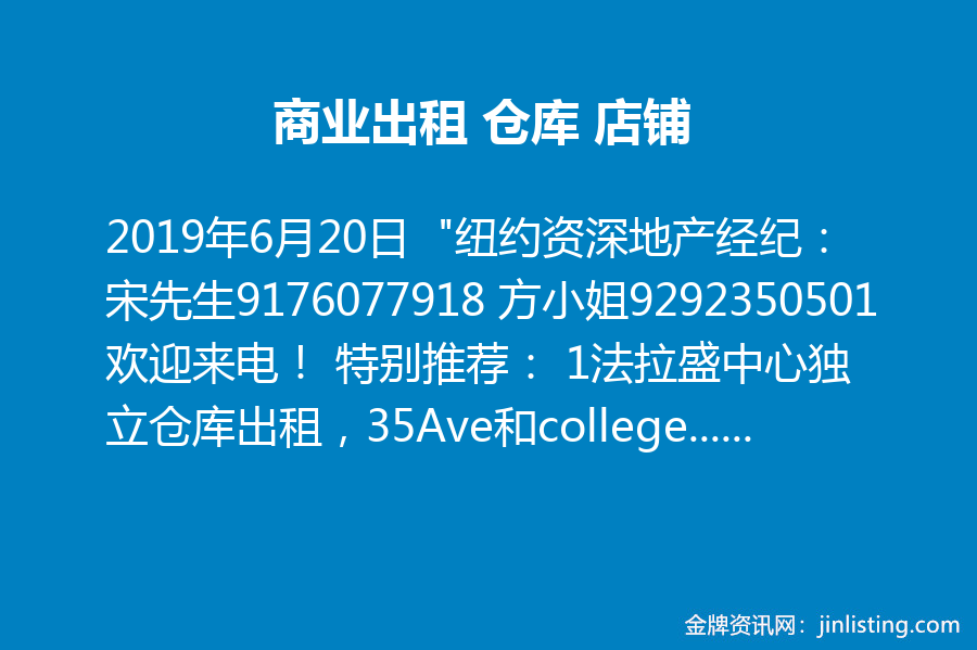 商业出租!仓库 店铺 “纽约资深地产经纪:宋先生9176077918 方小姐9292350501 欢迎来电! 特别推荐: 1法拉盛中心独立仓库出租,35Ave和college point交接处附近,面积8600尺多,租金22000/月包地税,欢迎咨询! 2.Maspeth大型仓库出租,有冷冻和冷藏,总共5万尺可分租,19尺高,卸货台、停车场都有,租金$22/尺,495上18出口,欢迎咨询 3大学点仓库 20 Ave 3800尺,18尺高,7个车位 租金7500 4大学仓库 20 Ave 一楼3800尺,二楼2500尺办公室 租金12000 5.布鲁克林靠278公路修车行出租,地面积1万尺,室内面积1500尺,租金$9900含地税,欢迎咨询”