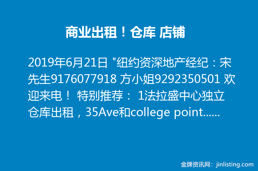商业出租!仓库 店铺 “纽约资深地产经纪:宋先生9176077918 方小姐9292350501 欢迎来电! 特别推荐: 1法拉盛中心独立仓库出租,35Ave和college point交接处附近,面积8600尺多,租金22000/月包地税,欢迎咨询! 2.Maspeth大型仓库出租,有冷冻和冷藏,总共5万尺可分租,19尺高,卸货台、停车场都有,租金$22/尺,495上18出口,欢迎咨询 3大学点仓库 20 Ave 3800尺,18尺高,7个车位 租金7500 4大学仓库 20 Ave 一楼3800尺,二楼2500尺办公室 租金12000 5.布鲁克林靠278公路修车行出租,地面积1万尺,室内面积1500尺,租金$9900含地税,欢迎咨询”