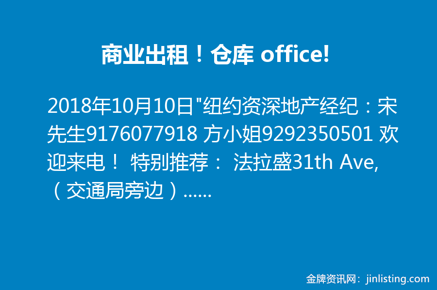 商业出租!仓库 office!纽约资深地产经纪:宋先生9176077918 方小姐9292350501 欢迎来电! “纽约资深地产经纪:宋先生9176077918 方小姐9292350501 欢迎来电! 特别推荐: 法拉盛31th Ave,(交通局旁边)办公室及18尺高仓库出租。一楼有若个仓库单位出租:3600尺仓库,租金 9000/月,小单位2600尺,租金$6500/月,另有两个3200尺仓库各租$8000/月。二楼办公室出租$22尺/每年。适合各行各业,租仓库送车位。欢迎合作,房东付佣金 法拉盛中心电梯office出租 38Ave 1400呎租金6500. 仓库出租 1)皇后区Maspeth山顶近495/278公路 59Ave/54st一楼仓库分租 面积3300尺 顶高13尺 租金6000包地税 押四”