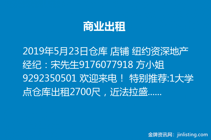 商业出租!仓库 店铺 纽约资深地产经纪:宋先生9176077918 方小姐9292350501 欢迎来电! “纽约资深地产经纪:宋先生9176077918 方小姐9292350501 欢迎来电! 特别推荐: 1大学点仓库出租2700尺,近法拉盛 租金6000 2.大学点28Ave/119街独立仓库出租,面积3000尺,二楼办公室1000尺,高23尺,租金$7500欢迎合作! 3大学点仓库 20 Ave 3800尺,18尺高,7个车位 租金7500 4大学仓库 20 Ave 一楼3800尺,二楼2500尺办公室 租金12000 5.布鲁克林278公路旁边修车行出租,地面一万尺,室内1500尺,租金15000含地税,以上欢迎合作! .”