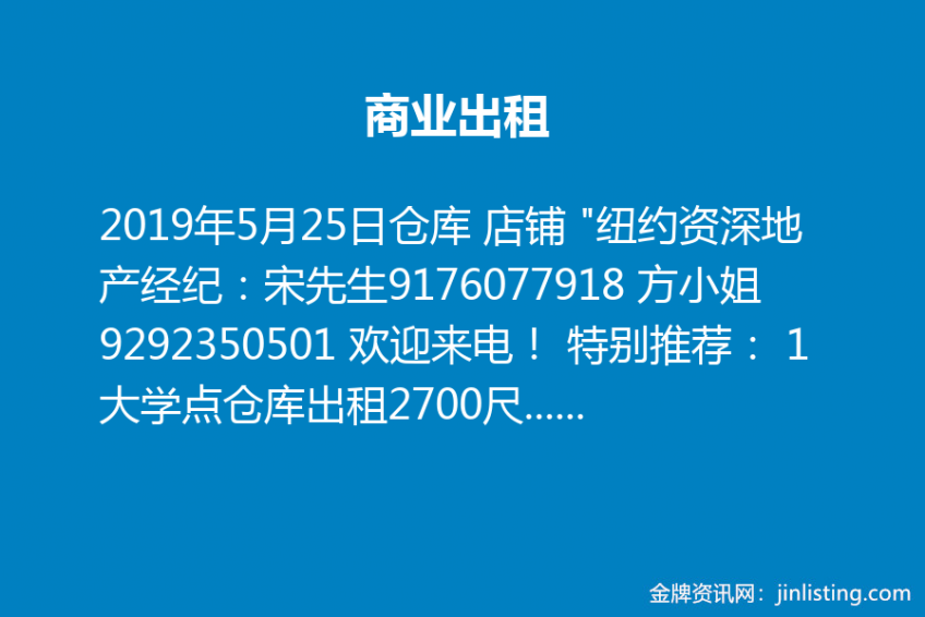商业出租!仓库 店铺 “纽约资深地产经纪:宋先生9176077918 方小姐9292350501 欢迎来电! 特别推荐: 1大学点仓库出租2700尺,近法拉盛 租金6000 2.大学点28Ave/119街独立仓库出租,面积3000尺,二楼办公室1000尺,高23尺,租金$7500欢迎合作! 3大学点仓库 20 Ave 3800尺,18尺高,7个车位 租金7500 4大学仓库 20 Ave 一楼3800尺,二楼2500尺办公室 租金12000 . 仓库出租 1)皇后区Maspeth山顶近495/278公路 59Ave/54st一楼仓库分租 面积3300尺 顶高13尺 租金6000包地税 押四”