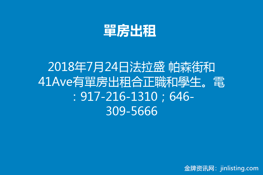 法拉盛 帕森街和41Ave有單房出租合正職和學生。電:917-216-1310;646-309-5666