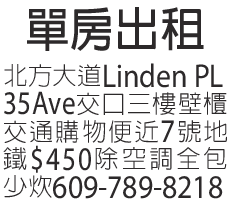 北方大道Linden PL和35Ave交口3樓有窗壁櫃交通購物便步行6分鐘到7號地鐵除空調外全包少炊一人$450