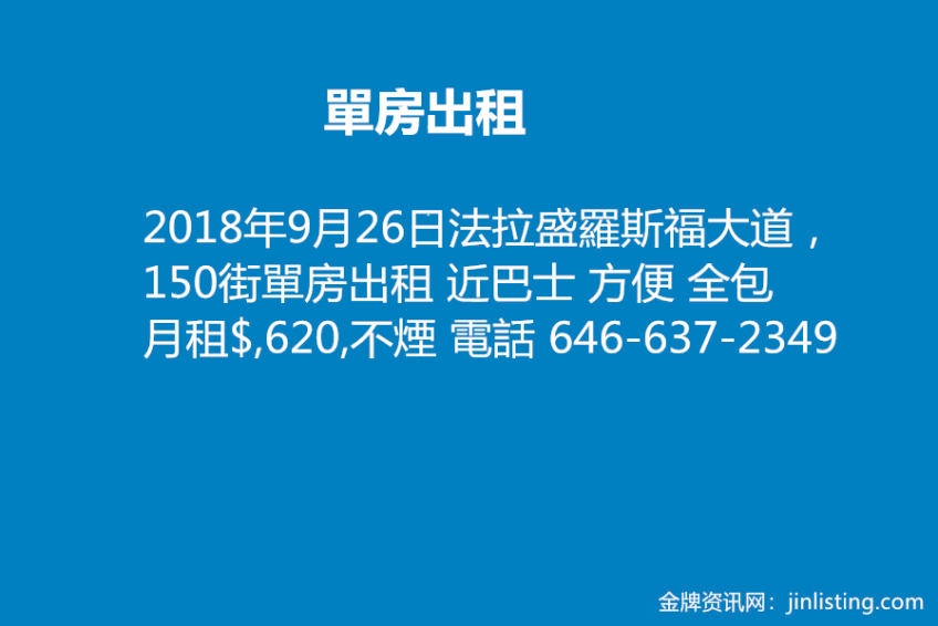 法拉盛羅斯福大道,150街單房出租,近巴士,方便,全包,月租$,620,不煙。電話:646-637-2349