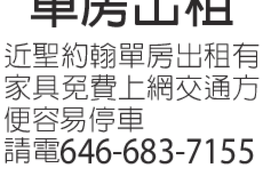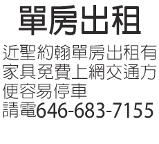 近聖約翰,有家具,免費上網,交通方便,容易停車請電646-683-7155