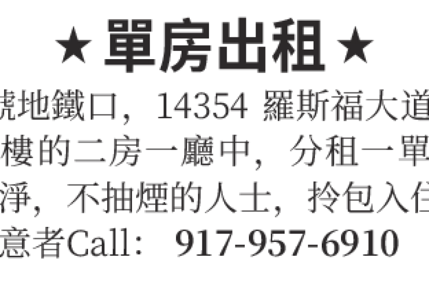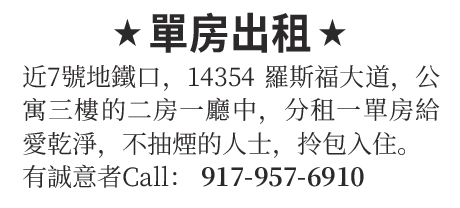 近7号地铁口,14354 罗斯福大道,公寓3楼的二房一厅中,分租一单房给爱干净,不抽烟的人士,拎包入住。有诚意者Call 9179576910