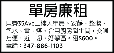 貝賽35ave3樓大單房。安靜,整潔,包水 電 煤,合用廚房衛生間,交通方便,近一切,好學區。$600電347-886-1103