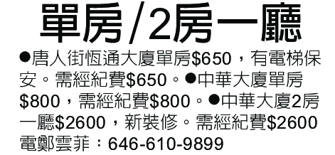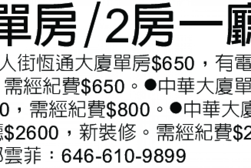 ● 中華大廈2 房一廳, $2600 新裝修 。 需經紀費$2600。 電鄭雲菲646-610-9899