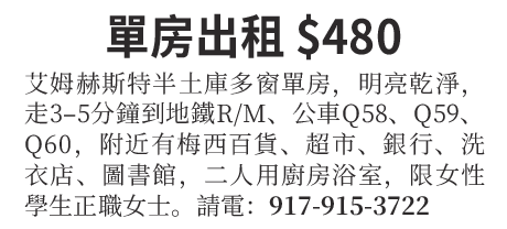 艾姆赫斯特單房限女性學生正職女士、走3–5分鐘到地鐵R,M車、公車Q58,Q59,Q60,附近有梅西百貨超市銀行洗衣店圖書館、二人用廚房浴室半土庫多窗明亮乾淨。
