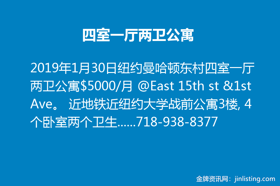 “No.RAM0651 纽约曼哈顿东村四室一厅两卫公寓$5000/月 @East 15th st &1st Ave。 近地铁近纽约大学战前公寓3楼, 4个卧室两个卫生间加一个客厅。 全明户型。实拍照片,欢迎私信索取video。另有大量曼哈顿和Queens纽约市区出租,出售房源,欢迎来电或是来信询问喔!咨询服务:王小姐(Wendy) 电话或微信可以预约当天看房。电话:718-938-8377 微信:Q612597 邮件:wendywendy2002@gmail.com 公司网址:http://www.taichirealty.com”