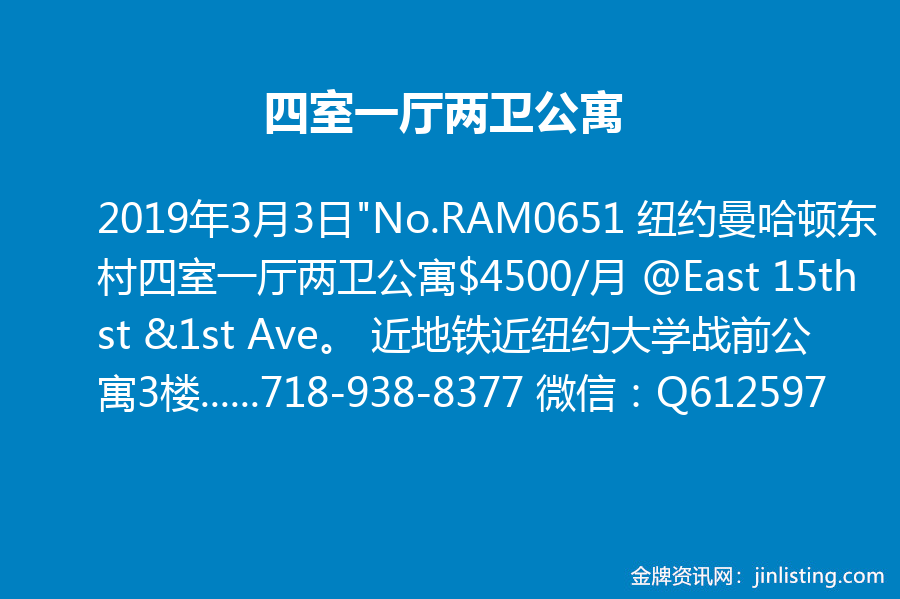 “No.RAM0651 纽约曼哈顿东村四室一厅两卫公寓$4500/月 @East 15th st &1st Ave。 近地铁近纽约大学战前公寓3楼, 4个卧室两个卫生间加一个客厅。 全明户型。实拍照片,欢迎私信索取video。另有大量曼哈顿和Queens纽约市区出租,出售房源,欢迎来电或是来信询问喔!咨询服务:王小姐(Wendy) 电话或微信可以预约当天看房。电话:718-938-8377 微信:Q612597 邮件:wendywendy2002@gmail.com 公司网址:http://www.taichirealty.com”