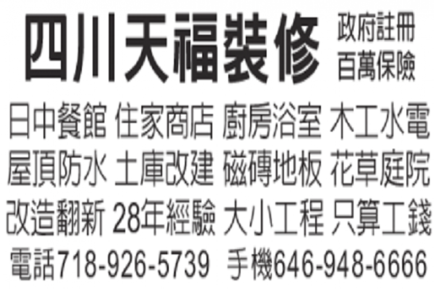 四川 天福裝修 政府註冊 百萬保險 718-926-5739 646-948-6666