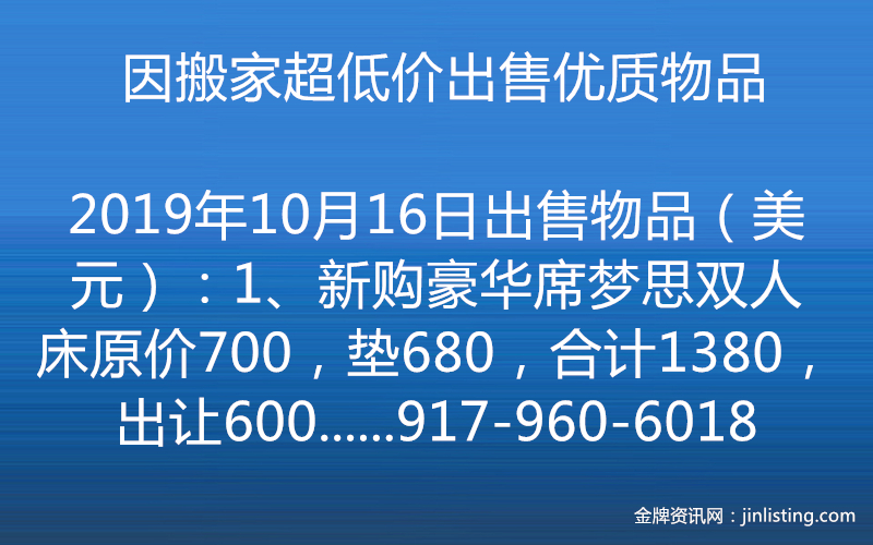 因搬家超低价出售优质物品 出售物品(美元):1、新购豪华席梦思双人床原价700,垫680,合计1380,出让600;2、九成新佳能彩色打印机,可打印信封,原价182,出售50;3、不锈钢高档水龙头,全新125,出售30;4、高效取暖机出售20;5、全新小孩写字桌出售10;6、DVD机 10元;7、上网路由器Internet router10元,地点:Elmhurst 金麟超市隔壁。请联系 Jack 917-960-6018