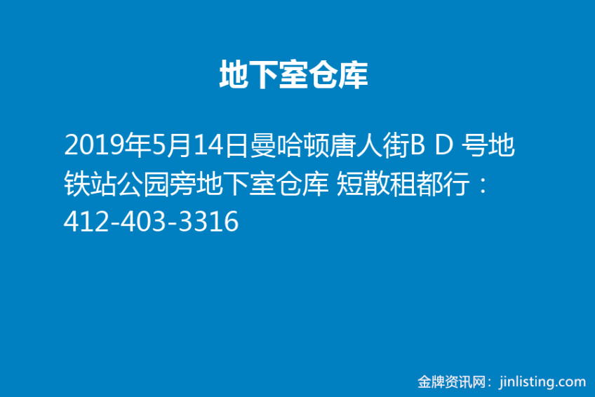 曼哈顿唐人街B D 号地铁站公园旁地下室仓库 短散租都行:412-403-3316