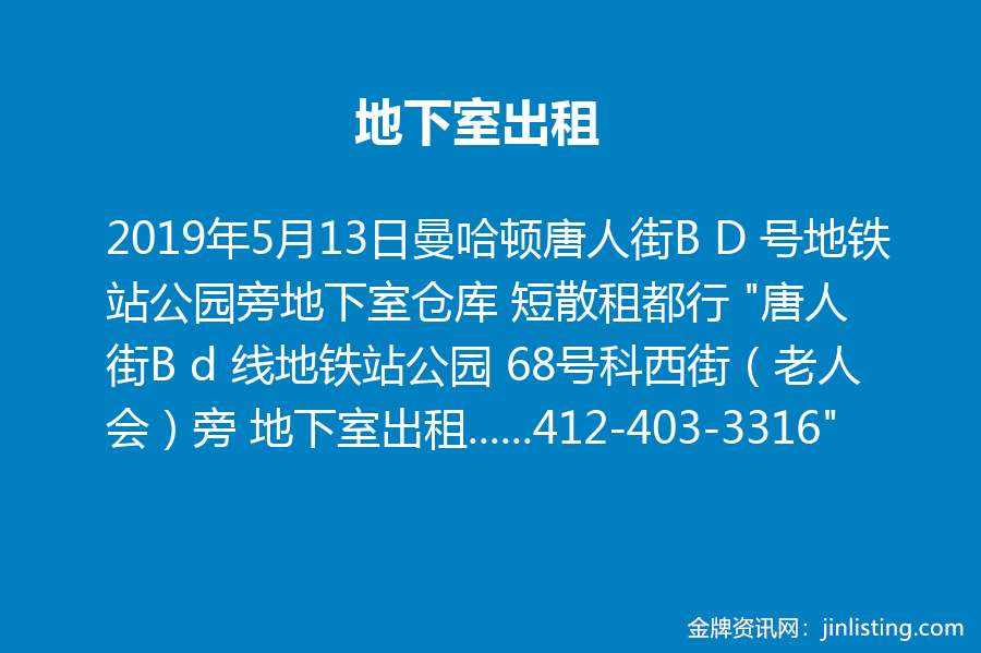 曼哈顿唐人街B D 号地铁站公园旁地下室仓库 短散租都行 “唐人街B d 线地铁站公园 68号科西街(老人会)旁 地下室出租 欢迎短租散租都行,电话联系:412-403-3316”
